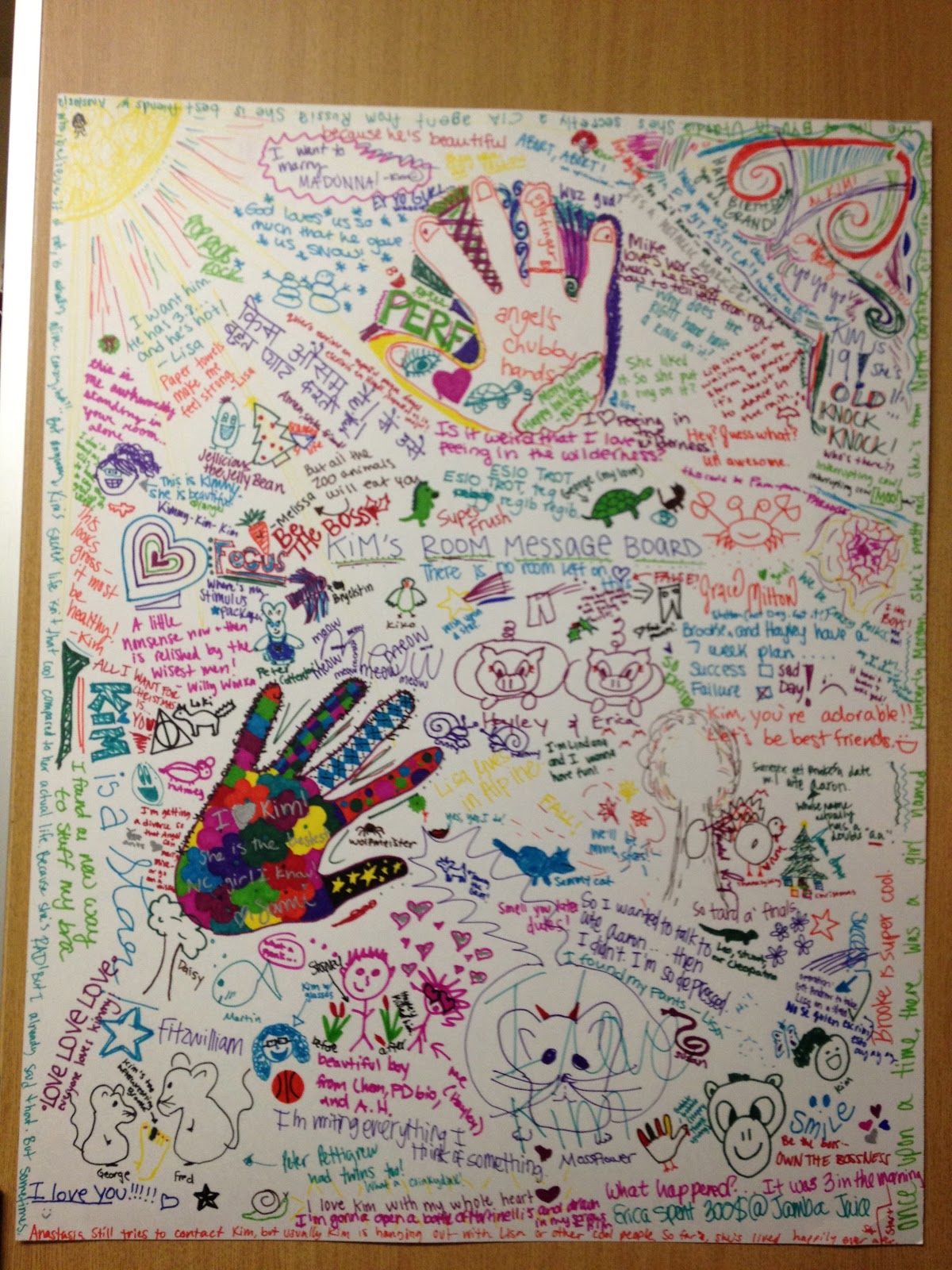 My friend Kim has had this poster hanging in her room all semester. We all have added drawings and written funny things that people have said through out the semester. There are a lot of great memories on there, especially all of the things Hayley drew in the very early hours of the morning. I think we finally filled it completely, so its a good thing Kim is getting a new one for next semester!
